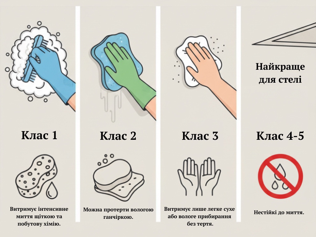 • 3 клас: Витримує лише легке сухе або вологе прибирання без тертя. Підходить для спалень.