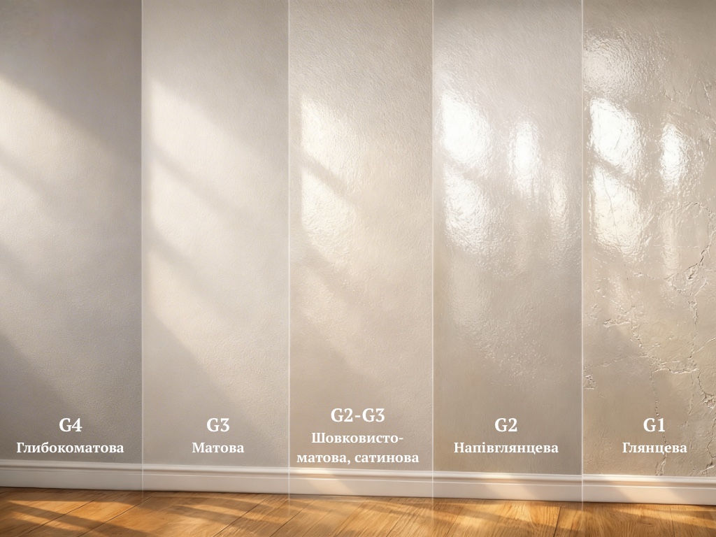 • Глибокоматова (G4): Повністю поглинає світло. Якщо стіни підготовлені не ідеально - це ваш порятунок. Вона створює оксамитовий ефект і приховує дрібні погрішності шпаклівки.