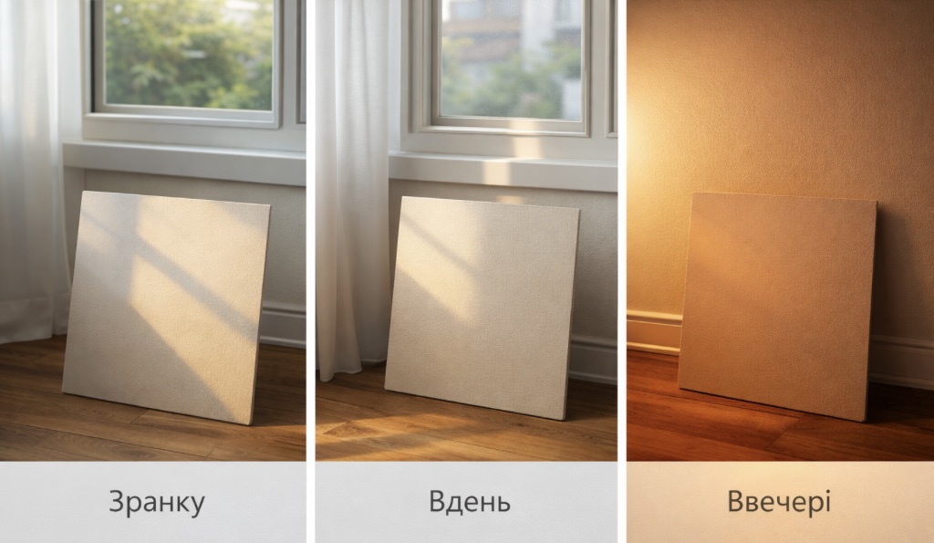 2. Перевірте світло: Подивіться на зразок кольору у вашому приміщенні зранку, вдень та ввечері при лампах. Оцініть, як колір виглядає в кутку (там він буде найтемнішим). Врахуйте, що тепле світло (жовте) робить кольори затишнішими, холодне - синюватими.