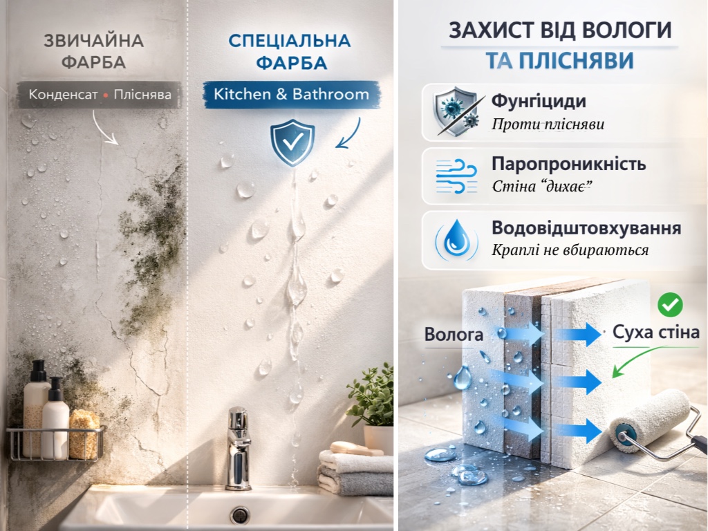 Для вологих приміщень звичайна фарба не підійде - з’явиться грибок. Шукайте на банках маркування «Для кухонь та ванних» (Kitchen & Bathroom).