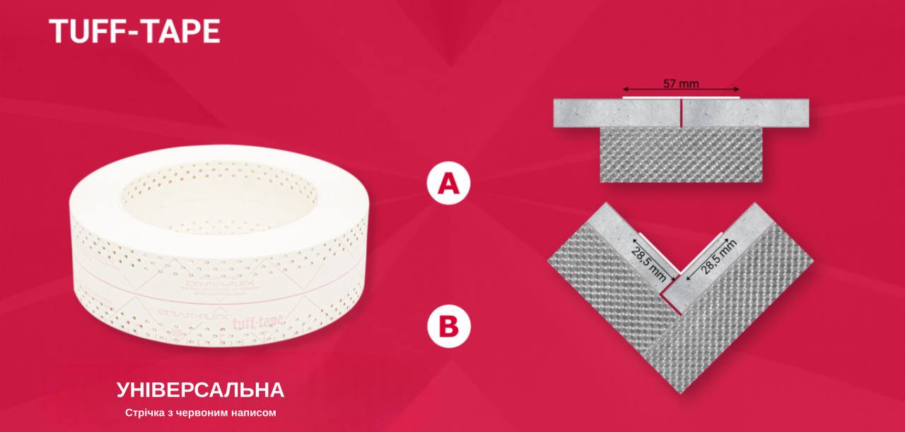 | Tuff-Tape (червоний) | TT | 57 | 0,40 | Плоскі шви та універсальний ремонт | Папір, сітка, флізелін |